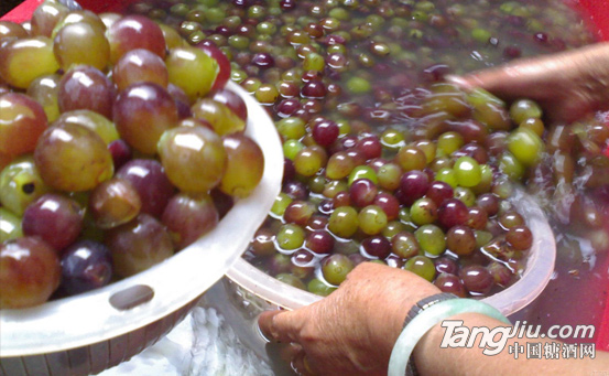 把剪好的葡萄冲洗干净,并用淡盐水浸泡十分钟左右,就可以去掉葡萄皮上的农药或其他对人体有害的物质,前面谈到葡萄伤了皮的不能用来自制葡萄酒,就是为了避免浸泡时盐水浸到果肉里面去了,影响葡萄酒的口味。然后再用清水冲洗一遍,再把水沥干。