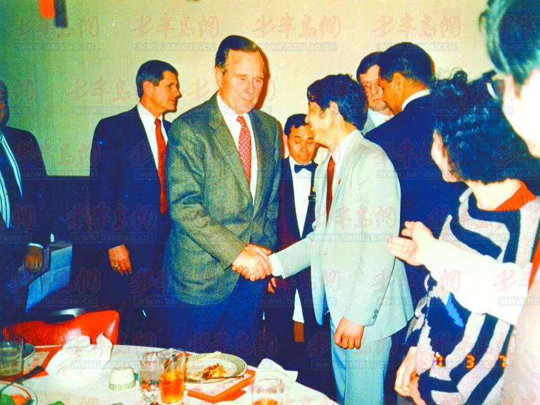 时任美国总统老布什是个有名的中国通,当他听说让出房间的是青岛啤酒考察团时兴奋不已。他走进青岛啤酒考察团用餐的包间,向考察团成员一一问候,对占用了青岛啤酒考察团预订的房间表示歉意。布什总统还和考察团成员聊起自己当年在中国时与青岛啤酒的种种往事,临别时他握住考察团领队张建华副厂长的手说:“青岛啤酒为美中两国人民增进友谊和了解搭起了桥梁。我们喜欢青岛啤酒!向你们员工的辛勤工作表示感谢!”时隔半月,回到青岛后,考察团成员收到了带有布什总统亲笔签名的照片,上面写着—“最良好的祝愿!乔治·布什。”
