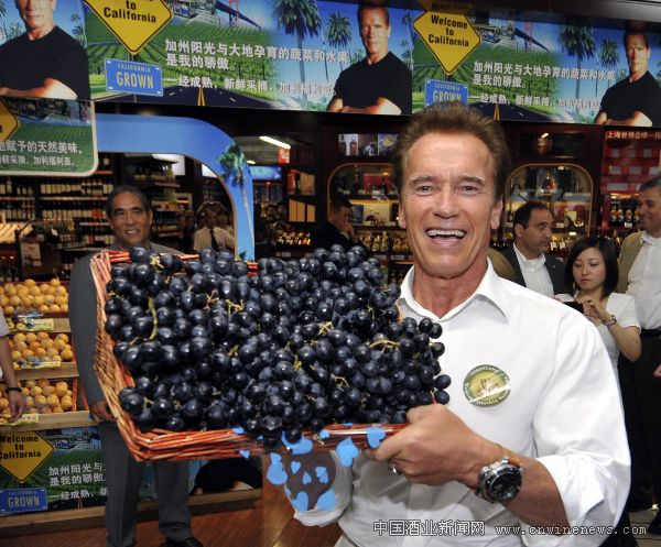 9月11日,美国加利福尼亚州州长、著名影星施瓦辛格来到杭州一家商场举行的加州美食节活动现场,向市民推销加州农产品。