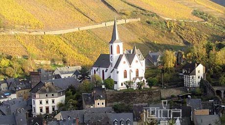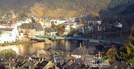 葡萄酒厂,翻译介绍说这里有刚刚酿好的白葡萄酒,典型的德国白葡萄酒的风格。顺着一个小山坡上去,一边是葡萄园,一边是美丽的小城。葡萄园已经要过冬了,色彩呈现的五彩斑斓,在整齐的划出一道道优美线条的低矮葡萄架上,跃动着红黄绿的鲜艳色彩,让这个安静的地方增加了灵动的美感。另一边是两山夹起来并缓缓延伸到一片开阔地的小城,在小城的中间是静静地闪着粼光的莫索尔河,阳光的照射给它披上了金色的光晕。