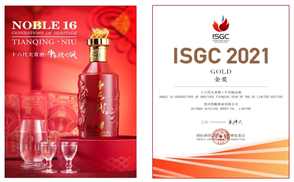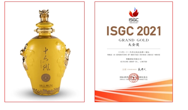 2021年10月23日,备受业界关注的2021国际烈酒(中国)大奖赛(ISGC)颁奖典礼在烟台盛大举行,贵州美酒链科技有限公司旗下的合作赋能产品“十六代?十二生肖文化纪念酒?鼠坛”荣获大金奖,另一款 “十六代天青酒?牛年限定版”获得金奖。这是继今年4月十六代系列产品荣获2021年德国iF设计大奖后,再次得到国际权威机构和行业的肯定。