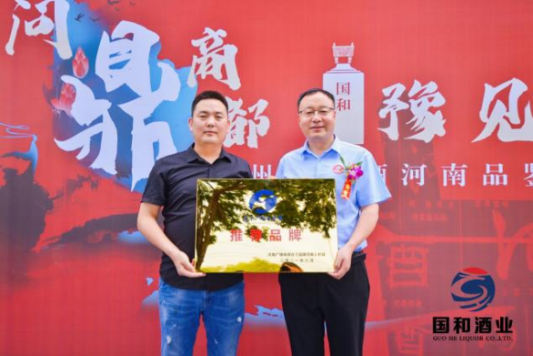 河南广播电视台《品牌河南》栏目向国和(河南)酒业公司总经理赵欣授与《品牌河南》栏目“推荐品牌”的荣誉牌匾。