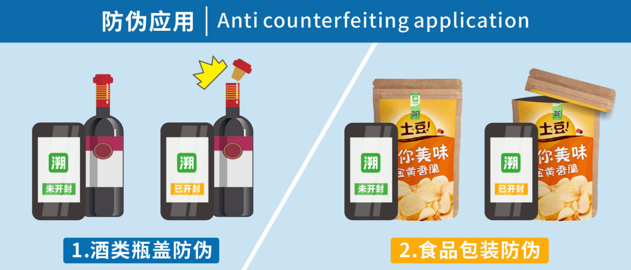 在酒瓶瓶盖、封口或包装处,嵌入RFID标签,为每一瓶酒赋予了独一无二的数字DNA。采用芯昊芯独家专利,如果中途被拆封,会触发芯片中的传感器,物品的开封状态将会被如实记录。消费者仅需用NFC手机触碰标签,便可快速查询物品的拆封状态,保护买卖双方的权益。除此之外,我们也可以为企业提供定制的防伪溯源方案。