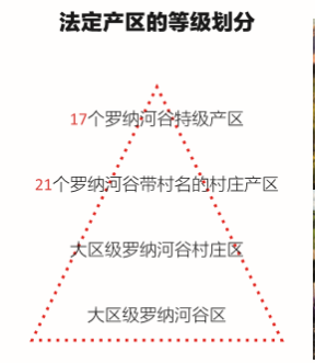 罗纳河谷区的葡萄酒分级呈现金字塔形,自下到上分别是:大区级罗纳河谷区、大区级罗纳河谷村庄区,罗纳河谷带村庄名字的村庄产区,罗纳河谷特级产区。