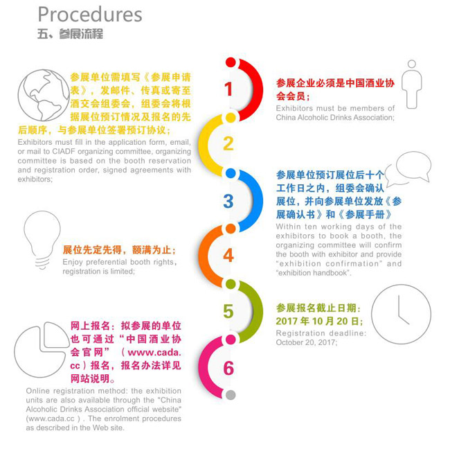 6.网上报名:拟参展的单位也可通过“中国酒业协会官网” (www.cada.cc)报名,报名办法详见网站说明。